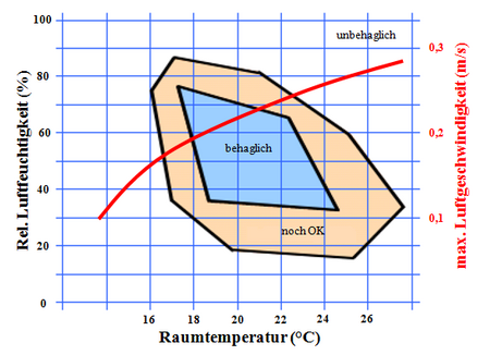 Ta diagram je treba razumeti tako, da se vedno počutimo udobno samo v prisotnosti zračne vlage in določene temperature, ko se presečišče obeh vrednosti nahaja v modrem območju, torej v območju udobja. Oranžno območje je že nekoliko slabše in ni priporočljivo biti pod temi pogoji. Če je presečišče izven označenih območij, nam skoraj zagotovo ne bo udobno.