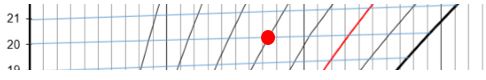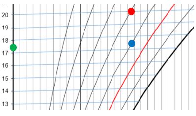 Od tam se premikamo vzporedno z modrimi črtami levo od lestvice temperature. V tem primeru bi bilo približno 17,5°C (zelena pika):