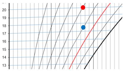 Na levi strani diagrama iščemo temperaturo prostora, pri kateri je bila izmerjena relativna vlaga. Na primer: 20°C. Od tam se premikamo po modri črti v desno, dokler ne dosežemo presečišča s krivuljo izmerjene vrednosti relativne vlage. Na primer: 60% (rdeča pika):