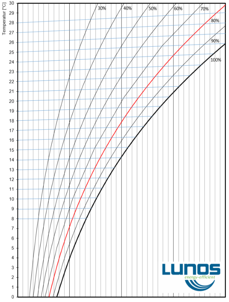 V našem diagramu je ena krivulja obarvana rdeče. Ta črta naj bi pokazala, da je to tako imenovana meja 80% relativne vlage. Nad to vrednostjo, kot je prikazano zgoraj, je tveganje za razvoj plesni bistveno višje kot pri običajni vrednosti. V našem primeru bi to pomenilo, da se od približno 15,5°C preseže 80% relativna vlaga na elementu, kar predstavlja znatno povečano tveganje za razvoj plesni, če na elementu obstaja vzrok za razmnoževanje (npr. umazanija ali sam material lahko služi kot vzrejno mesto). Torej vidimo, da se lahko že pri relativni vlagi 60% (le primer, seveda) plesen začne razvijati pri temperaturah 15,5°C in višje.
